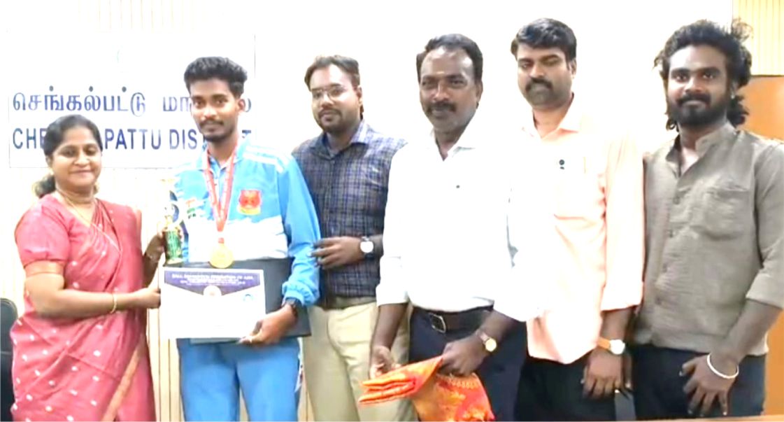 செங்கல்பட்டு: செங்கல்பட்டு பகுதியை சேர்ந்த அஜித் குமார் சர்வதேச அளவில் நடைபெற்ற முதல் சர்வதேச பூப்பந்து போட்டியில் இந்திய அணிக்காக விளையாட தமிழ்நாடு சார்பாக கலந்து கொண்டு தங்க பதக்கத்தை பெற்று இந்தியாவிற்கும் தமிழகத்துக்கும் பெருமை சேர்த்துள்ளார். மேலும் அவர் சொந்த ஊரான செங்கல்பட்டு மாவட்டம், செங்கல்பட்டிற்குவந்து சேர்ந்த அவருக்கு இரயில் நிலையத்தில் இரயில்வே ஸ்டேஷன் மாஸ்டர் மற்றும் பயிற்சியாளரும், செங்கல்பட்டு மாவட்ட பூப்பந்தாட்ட கழகத்தின் தலைவரும் ஆகிய சந்திரசேகர், ஆலோசகர் போலீஸ் பாலு, ரியல் ஸ்போர்ட்ஸ் அகாடமி திலக், திரளான பூப்பந்து விளையாட்டு வீரர்கள், பொதுமக்கள் மற்றும் பெற்றோர் சிறப்பான வரவேற்பு அளித்தனர். என்பது குறிப்பிடத்தக்கது. இதனைத் தொடர்ந்து இந்த மாணவனை செங்கல்பட்டு மாவட்ட ஆட்சியர் .எஸ். மாலதி ஹெலன் அவர்கள் நம் நாட்டுக்கு பெருமை சேர்த்த மாணவனை சால்வை அணிந்து வாழ்த்து தெரிவித்தனர்.